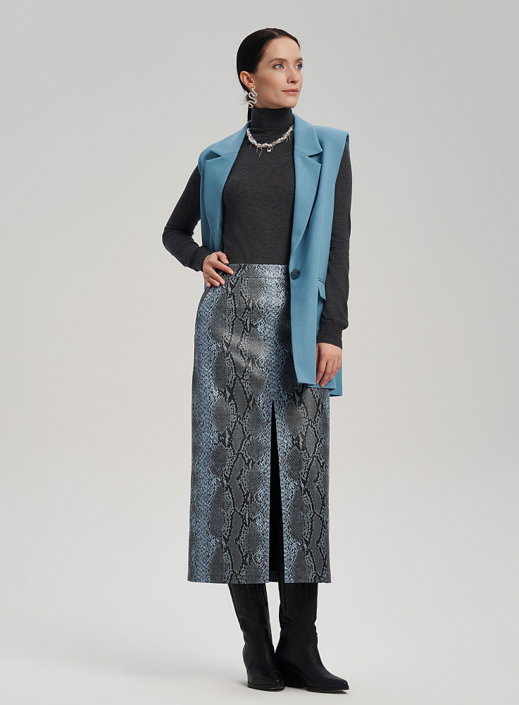 Юбка из экокожи с вырезом станет незаменимым элементом вашего гардероба. Подойдет для демисезонной погоды, от весенних до осенних вечерних прогулок. Эффектно смотрится в деловой и в праздничной обстановке. Базовая стильная модель длины миди ниже колена выполнена из качественной искусственной кожи. Облегающий фасон создает утонченный женственный силуэт. Средняя посадка визуально удлиняет ноги, стройнит. Аккуратно подчёркивает бедра и обеспечивает эффект элегантности и изысканности. Разрез спереди добавляет необычную нотку, позволяя двигаться свободно. Винтажный мотив и плотная фактура делают её отличным выбором как для работы в офисе, так и для особых выходов. Благодаря универсальному приталенному дизайну и завышенной талии, изделие легко сочетается с любыми образами. Элегантный наряд создан для женщин с разным типом фигуры. Будет хорошо сидеть на невысоких девушках. Нарядная кожаная юбка ниже колен поможет обрести комфорт и уверенность в любой ситуации. Это идеальное решение для тех, кто стремится выглядеть модно и стильно в любое время года.